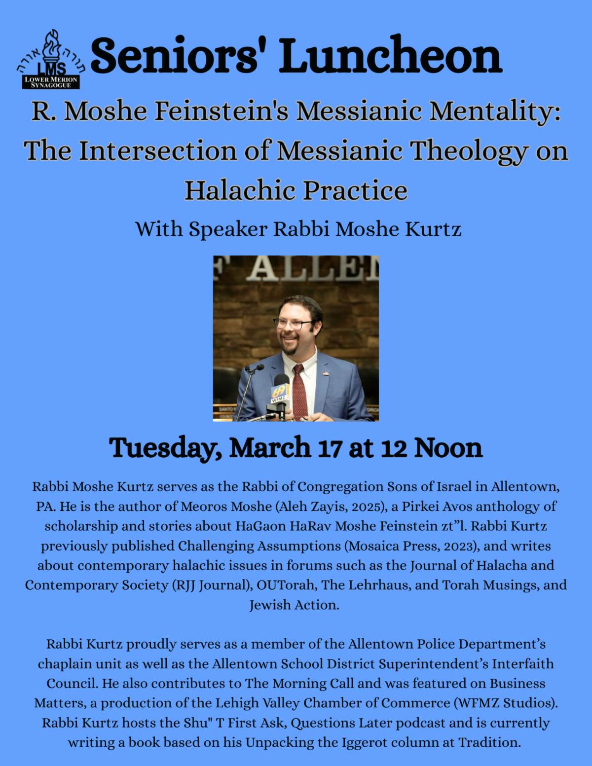Sr. Lunch & Learn at 12 Noon with Rabbi Moshe Kurtz