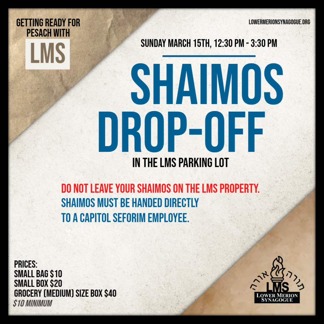 Shaimos Drop Off for a cost: 12:30 PM - 3:30 PM